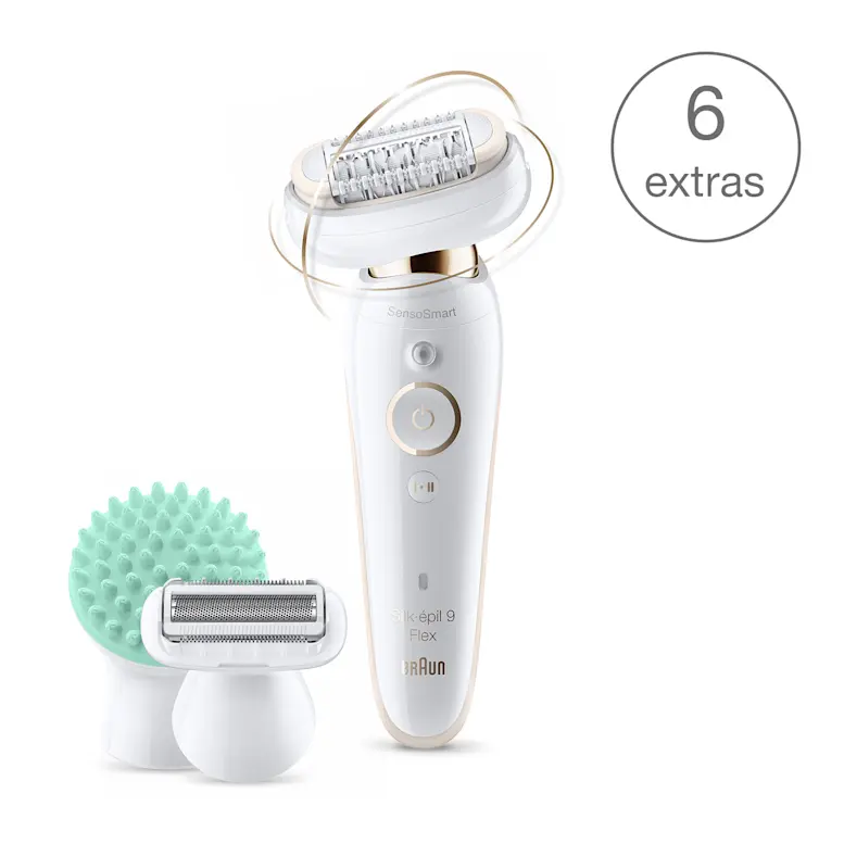Braun Silk·épil 9 Flex epilator with multiple attachments including exfoliation, massage, and shaving heads.