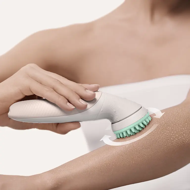 The massage roller cap gently stimulates wet and dry skin for more comfort while using your epilator.