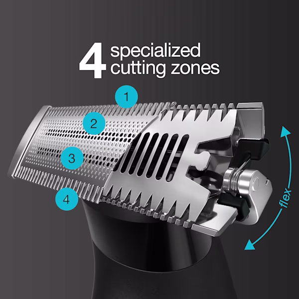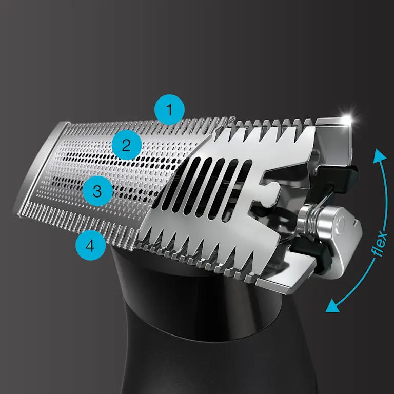 Precision och kontroll, med självförtroende: det rörliga Flex-huvud anpassar sig efter ansiktets konturer för att effektivt fånga in hår. 4 D-bladdesignen gör att du kan forma och fixa stilen, oavsett din skicklighetsnivå.