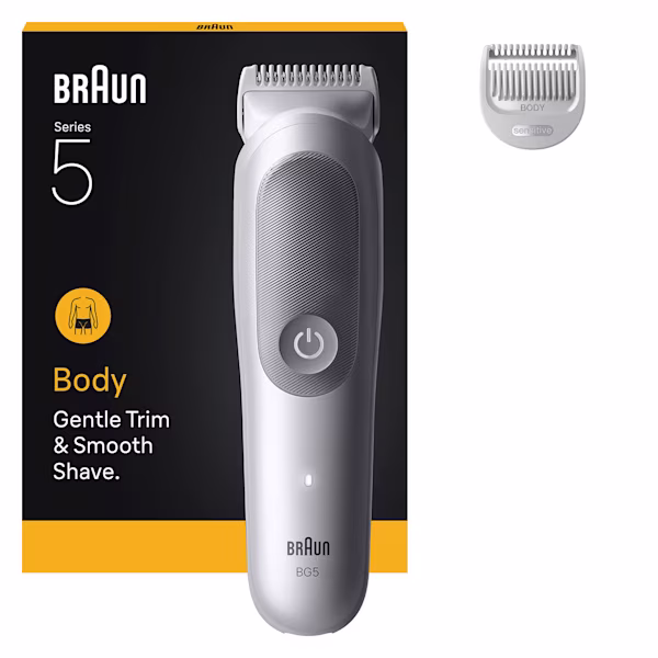 Skonsam trimning & slät rakning: Brauns kroppstrimmer för män, Series 5, ger hudkomfort även i känsliga områden.